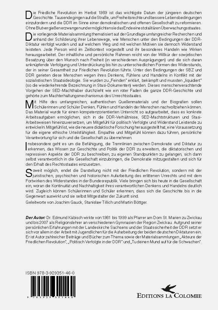 Die vorliegende Materialsammlung thematisiert auf der Grundlage umfangreicher Recherchen und anhand der Schilderung ihrer Lebenswege, wie Menschen unter den Bedingungen der DDR-Diktatur verfolgt wurden und auf welchem Weg und mit welchen Motiven sie dennoch Widerstand leisteten. Jede Person wird im Zeitkontext vorgestellt und ihr besonderes Handeln wie Wirken herausgearbeitet. Der inhaltliche und persönliche Rahmen reicht von der Willkür der sowjetischen Besatzung über den Wunsch nach Freiheit (in verschiedenen Ausprägungen) und die sich daran anknüpfende Verfolgung und Unterdrückung bis hin zu unterschiedlichen Formen des Widerstands, der in seiner Gesamtheit zur Friedlichen Revolution führte. Unter den Bedingungen der SBZ und DDR gerieten diese Menschen wegen ihres Denkens, Fühlens und Handelns in Konflikt mit der sozialistischen Staatsideologie. Sie wurden zu „Feinden“ erklärt, bekämpft und mussten „liquidiert“ (so die wiederkehrende Bezeichnung in Stasi-Dokumenten) werden. Dieses menschenverachtende Vorgehen der SED-Machthaber durchzieht wie ein roter Faden die ganze DDR-Geschichte und gehörte zum Machterhaltungsmechanismus des Unrechtsstaates.