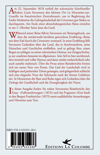 1878 durchquerte der berühmte schottische Schriftsteller Robert Louis Stevenson die Cévennen in Begleitung der Eselin Modestine. Aus seinem Reisetagebuch entstand diese mittlerweile berühmt gewordenen Erzählung, in der sich Gedanken über Land, Leute und Geschichte mit der Reisebschreibung vermischen. Manchmal anrührend, dann wieder ironisch und voller Humor, melancholisch oder auch zutiefst realistisch, singt Stevenson das Lied der Landschaft in kräftigen und packenden Tönen, gelegentlich schleicht sich eine elegische Note der Sehnsucht nach der fernen Geliebten ein.